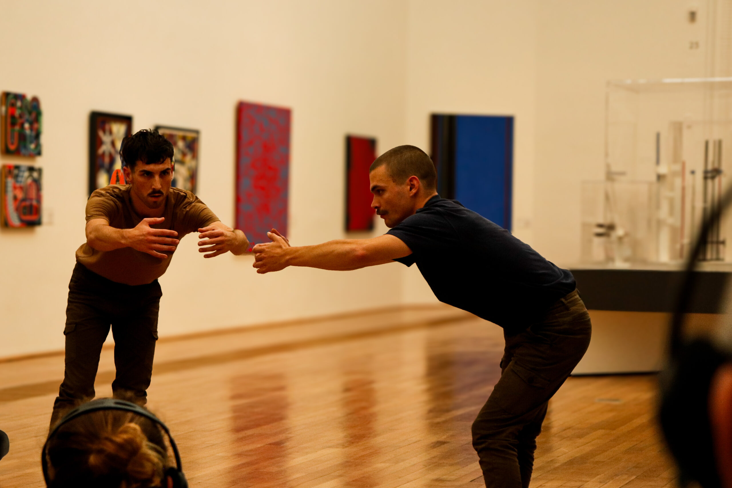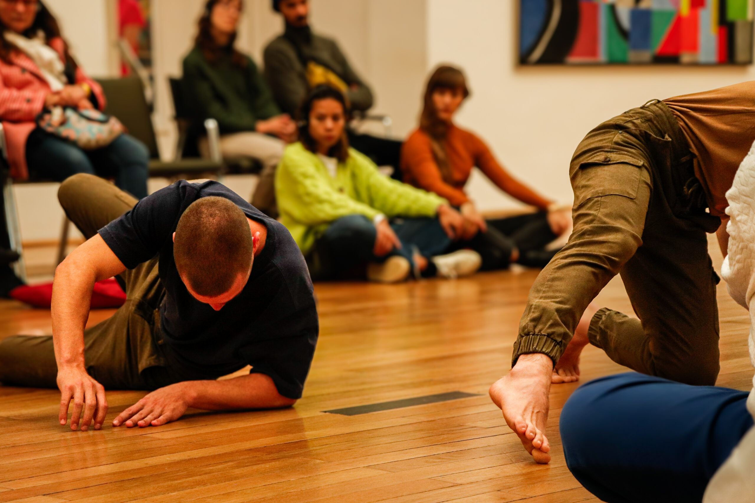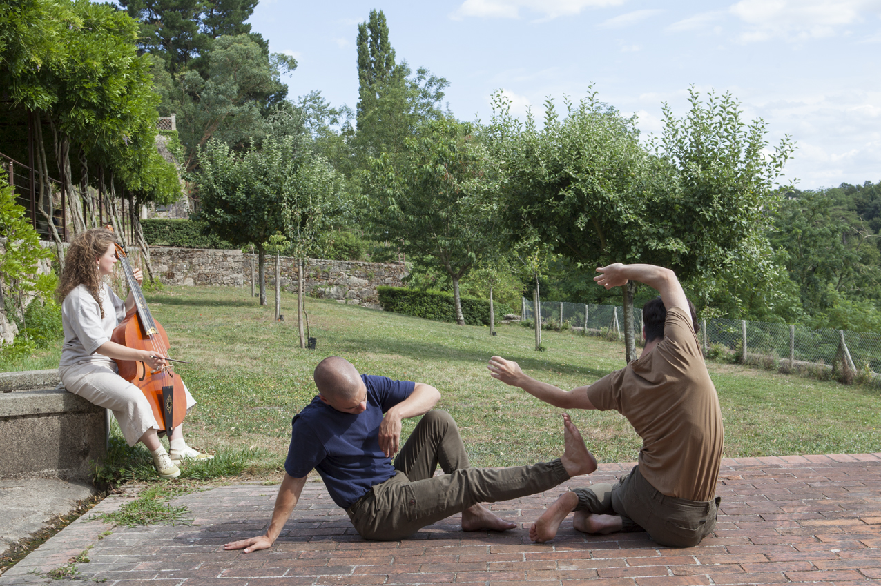 Le public s’installe autour, sur trois des côtés, laissant le quatrième à la gambiste qui accompagne le duo. La viole de gambe vient nous enivrer dans un univers baroque qui prend ici tout son sens. Cette composition tri-frontale est en relation directe avec la musique et le dessin des jardins à la française du XVIIe siècle. Le lent cheminement des corps et leurs postures ouvrent le regard des spectateurs et proposent de nouvelles perceptions.
